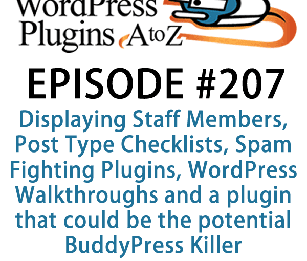 It’s Episode 207 and we’ve got plugins for Displaying Staff Members, Post Type Checklists, Spam Fighting Plugins, WordPress Walkthroughs and a plugin that could be the potential BuddyPress Killer. It’s all coming up on WordPress Plugins A-Z!