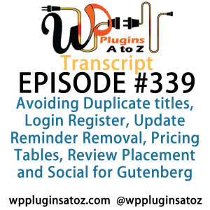 Transcript of Episode 339 WP Plugins A to Z Avoiding Duplicate titles, Login Register, Update Reminder Removal, Pricing Tables, Review Placement and Social for Gutenberg January 15, 2018 Read More »